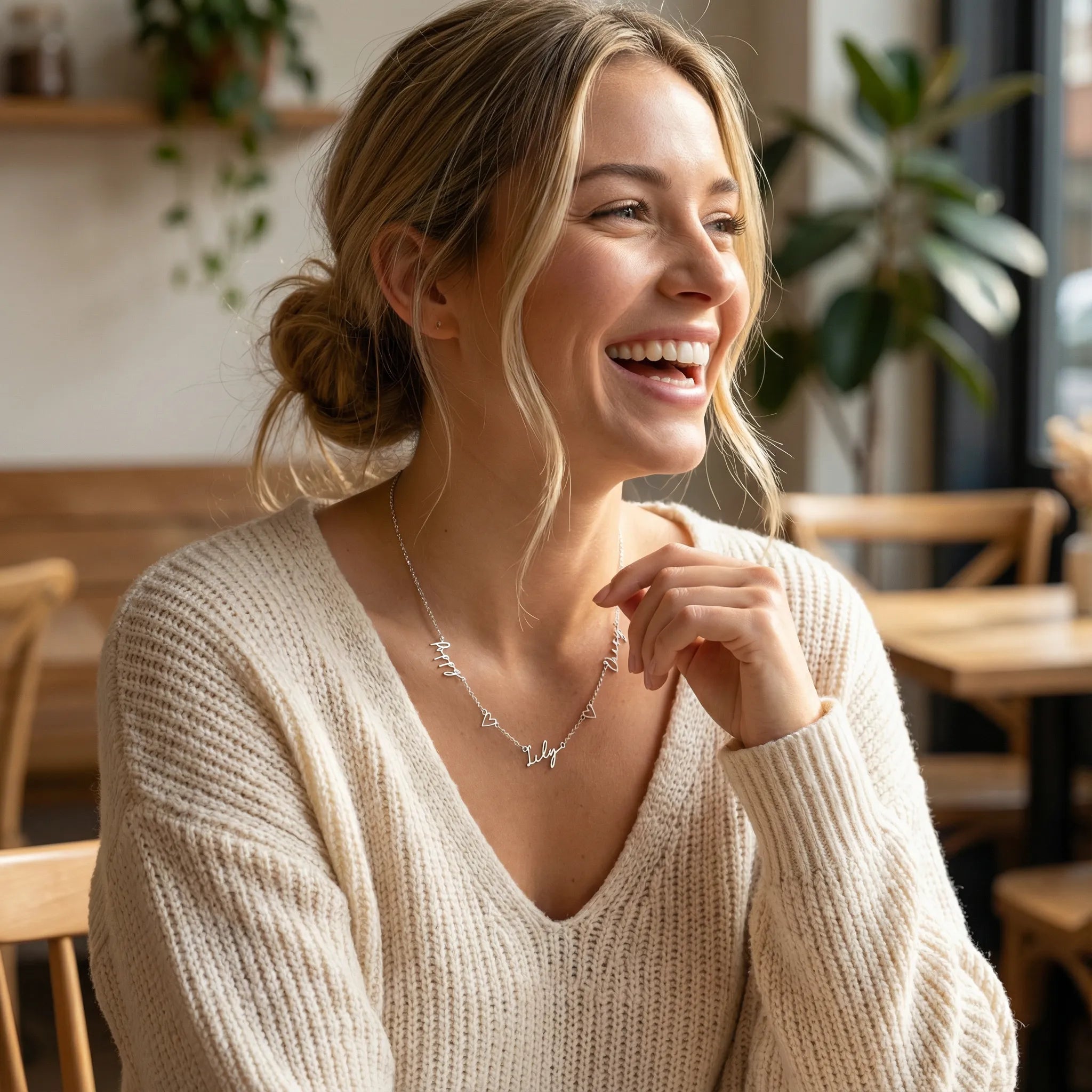 Celebrate the people you love with this beautifully flowing triple name necklace, complete with two delicate heart charms between each name. Designed to feel personal, meaningful and effortlessly elegant, it’s perfect for mums, partners or anyone who wants to carry their favourite names close.