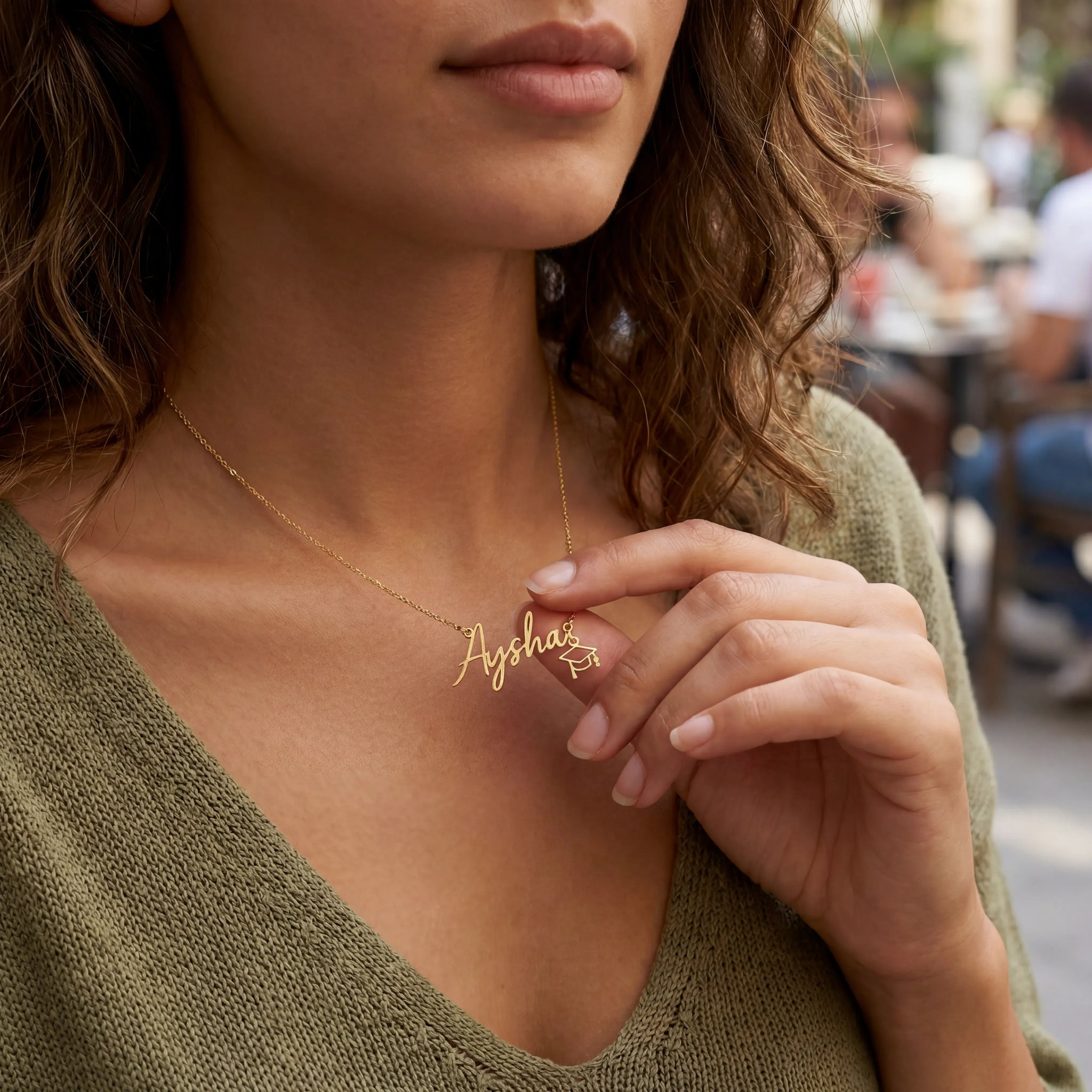 - Custom name necklace with fixed graduation cap charm