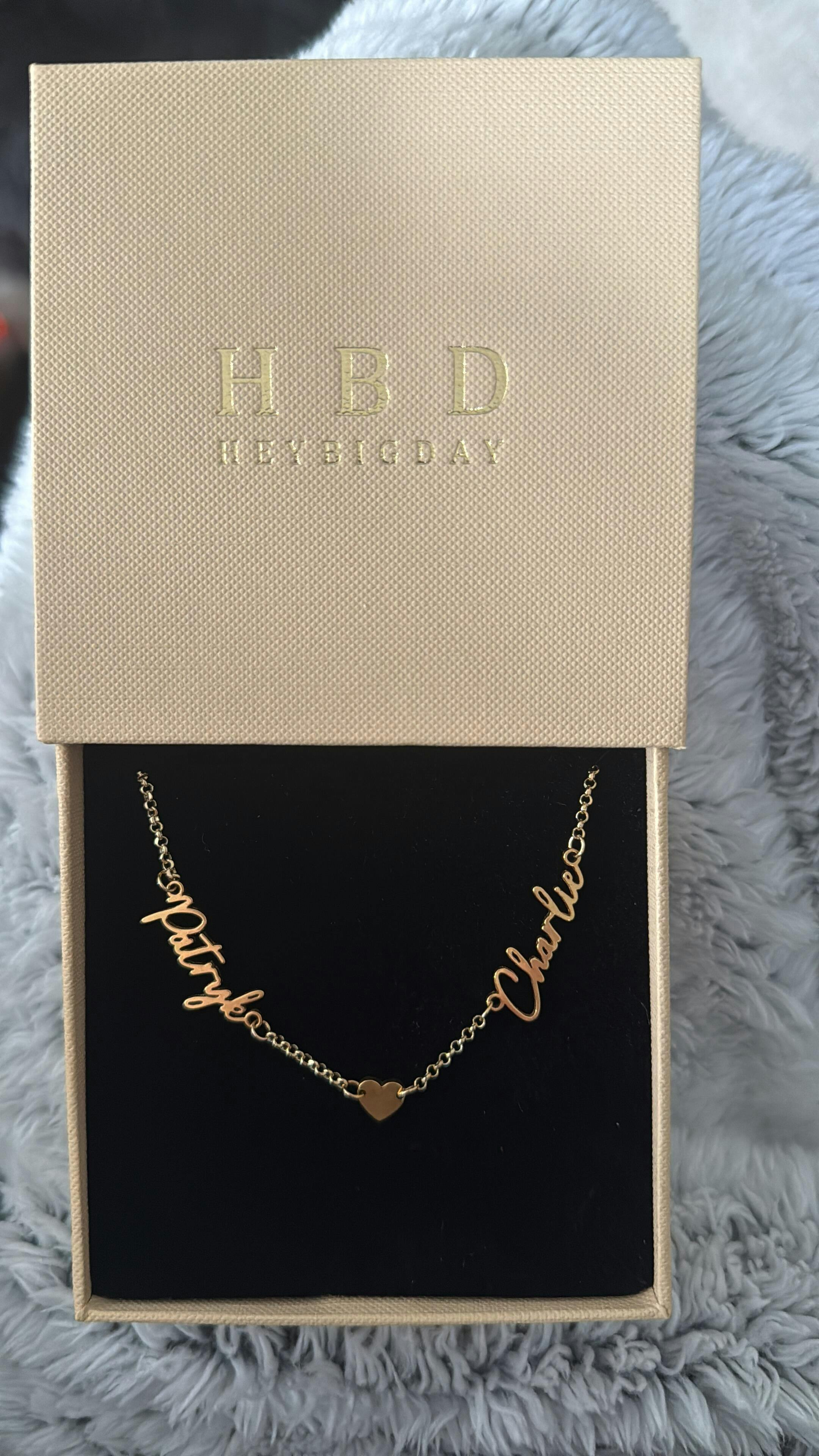 This beautiful double name necklace is designed to celebrate the people who matter most. Featuring two elegant script names joined by a polished solid heart, it’s a meaningful piece made for wearing close every day. Available in premium vermeil or solid silver, it’s a stunning keepsake with a luxury finish.