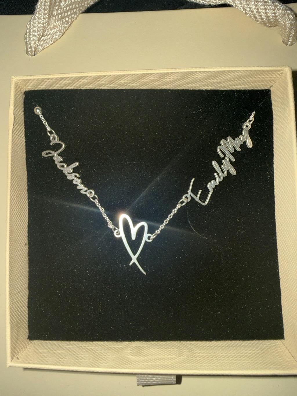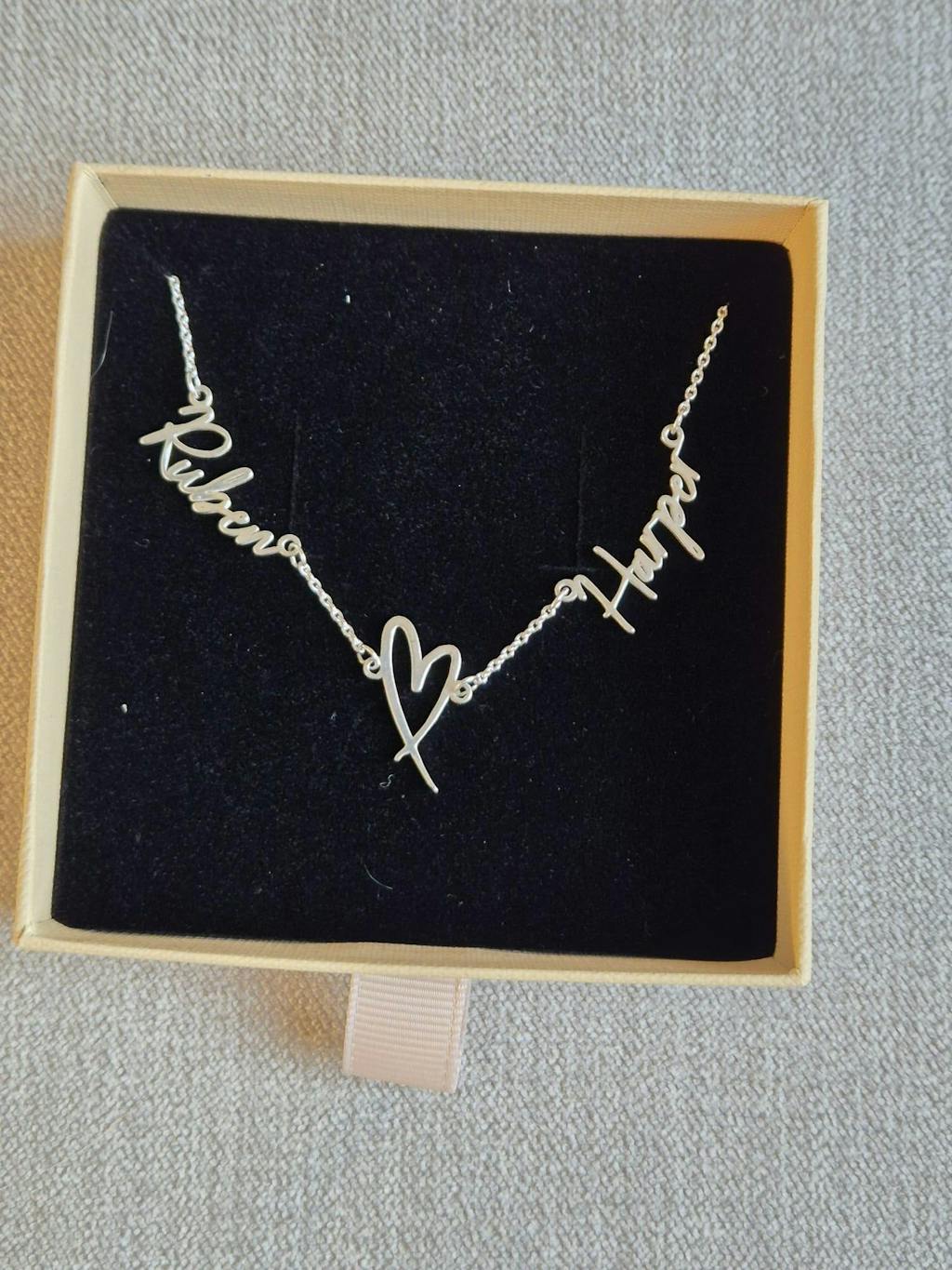 Double Name with Heart Necklace – a romantic twist on our signature double name design. This elegant piece connects two names with a delicate heart in the centre, symbolising love, friendship and togetherness. A beautiful way to keep your favourite people close, always.