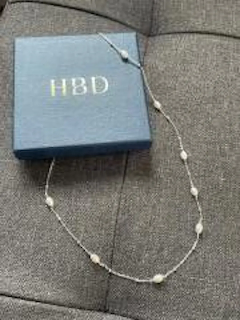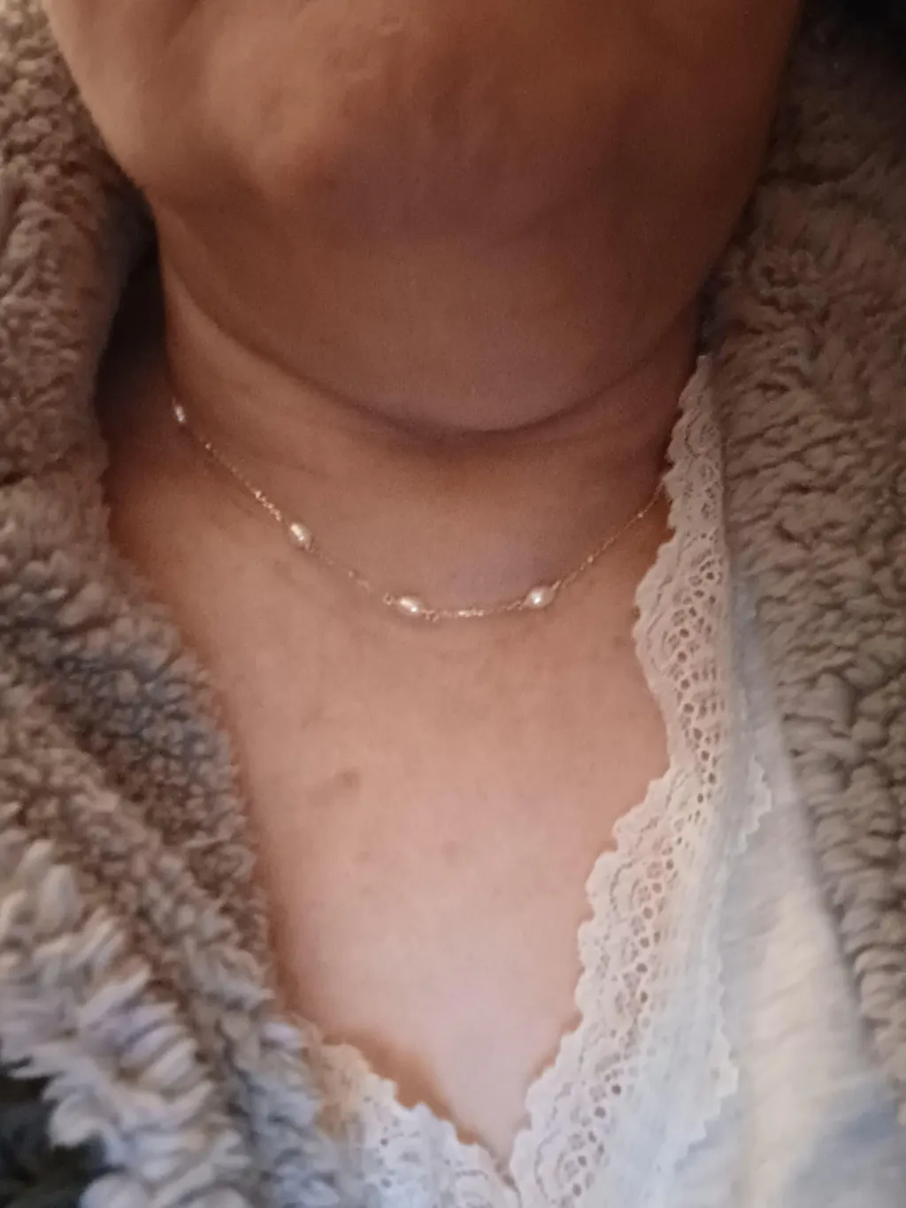 This is the more delicate of our pearl styles, with 4mm white freshwater pearls interspersed with subtle metal spheres along a fine chain. It’s a graceful piece that can be worn on its own or paired with our matching bracelet and earrings for a coordinated look.