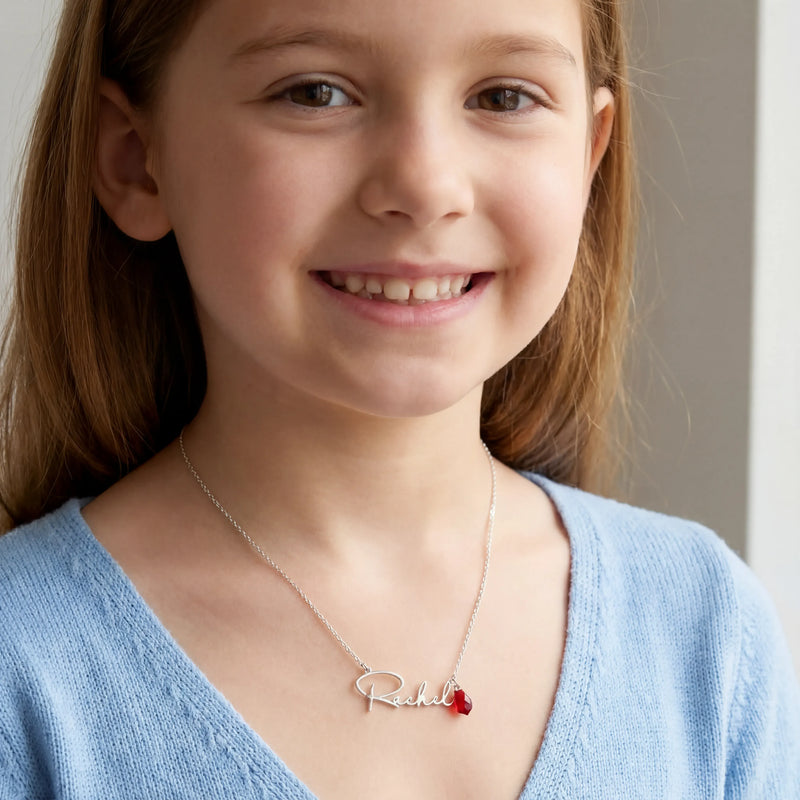 A timeless piece with a personal touch – this custom name necklace is available in 18ct gold or sterling silver, with your choice of chain style and the option to add a delightful charm. Whether it’s their name or a word full of meaning, it’s made especially for them.