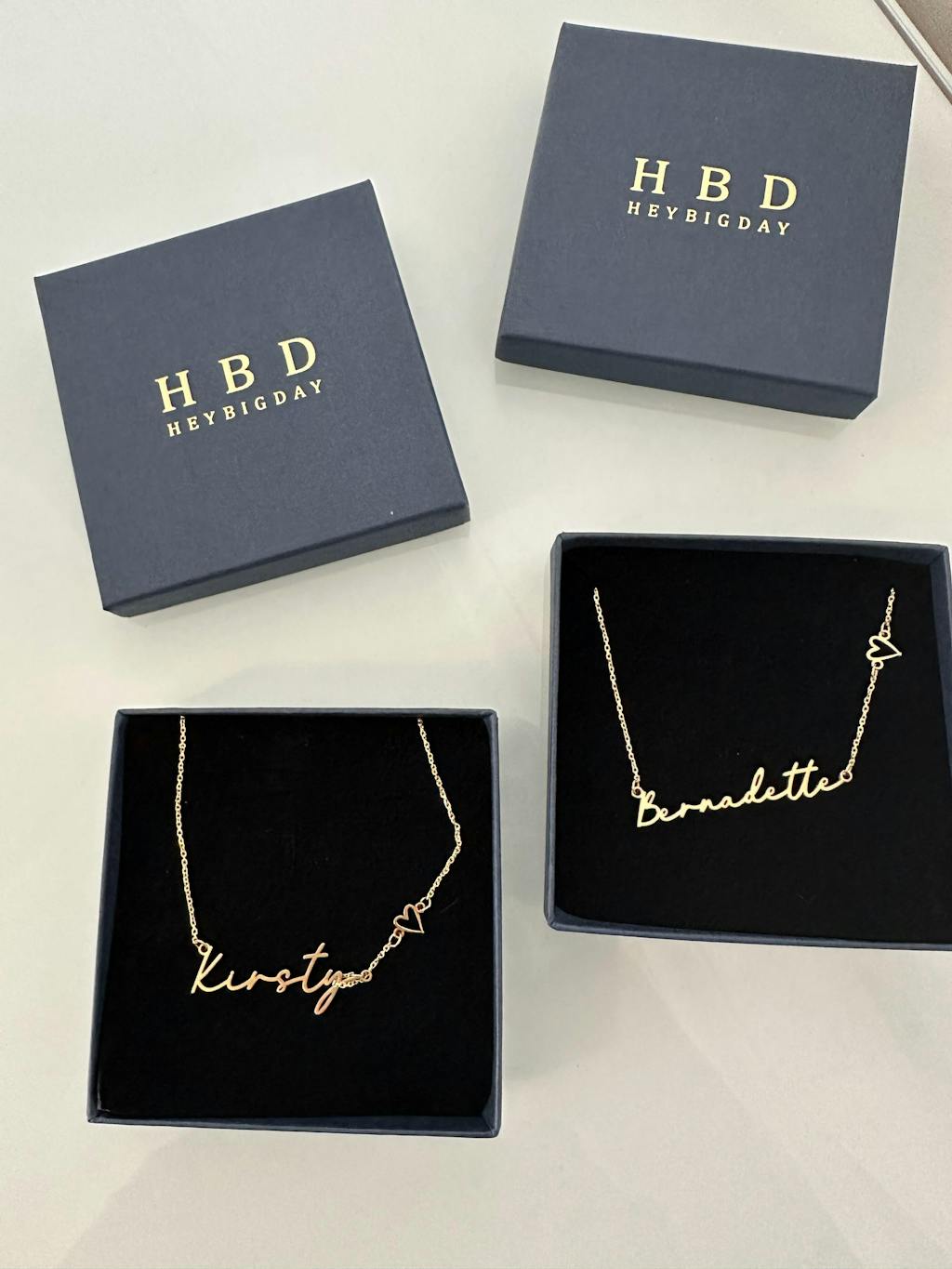 Our Personalised Name & Heart Necklace is a sweet and stylish way to wear a name that means the most to you. Crafted in your choice of 18ct gold, sterling silver or gold vermeil, this necklace combines a custom script nameplate with a delicate heart charm on the chain. With lengths from 15" to 21", it’s perfect for layering or wearing as an everyday signature piece.