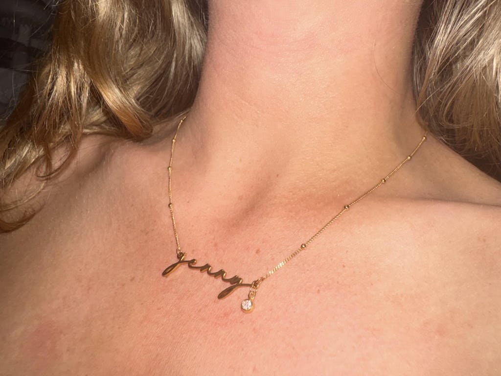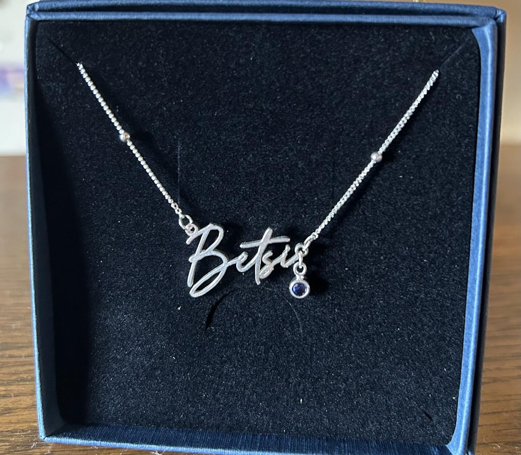 This personalised name necklace is finished with a delicate cubic zirconia birthstone charm, adding a subtle pop of sparkle and meaning. Custom-made with your chosen name and birthstone, it’s a timeless piece designed to be worn every day or gifted for life’s big moments.