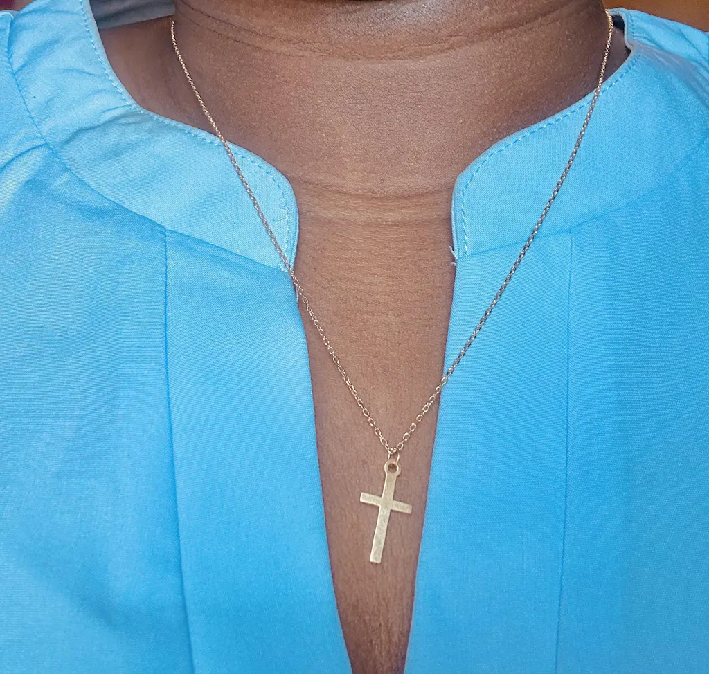 Detta eleganta vertikala korshalsband är en tidlös symbol, designat med rena linjer och en modern silhuett. Enkelt men ändå meningsfullt, det är ett smycke som både kan bäras vackert i lager och stå självsäkert på egen hand.